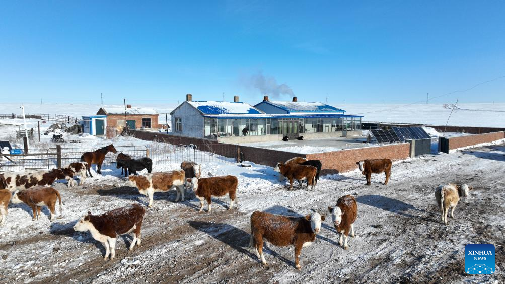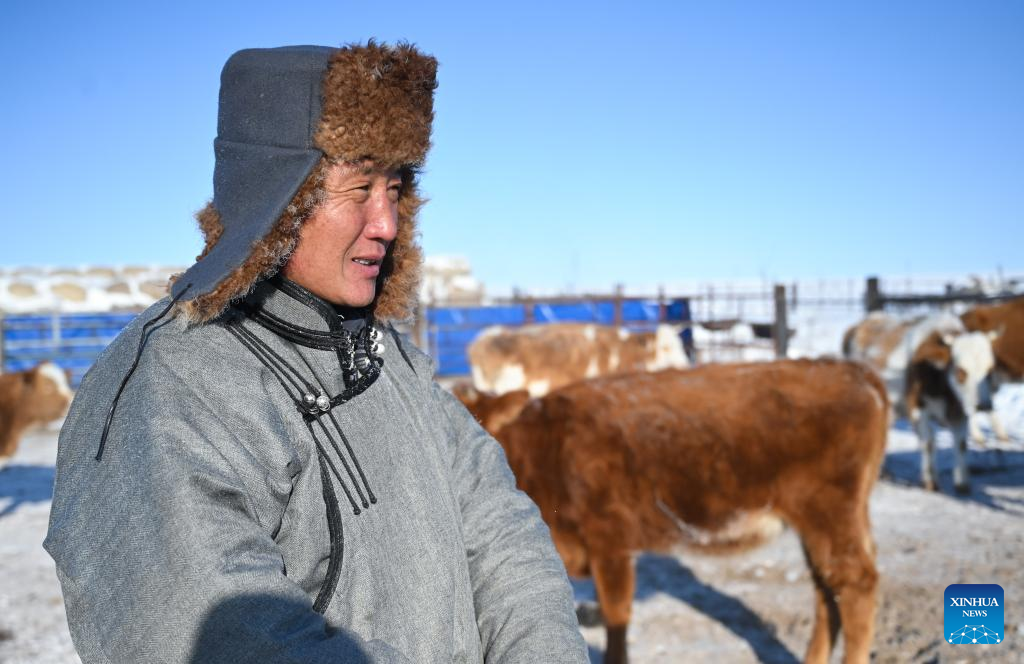 Erdendalai looks at his cattle at home in Hulun Buir, north China's Inner Mongolia Autonomous Region, Dec. 16, 2023. (Xinhua/Wang Kaiyan)