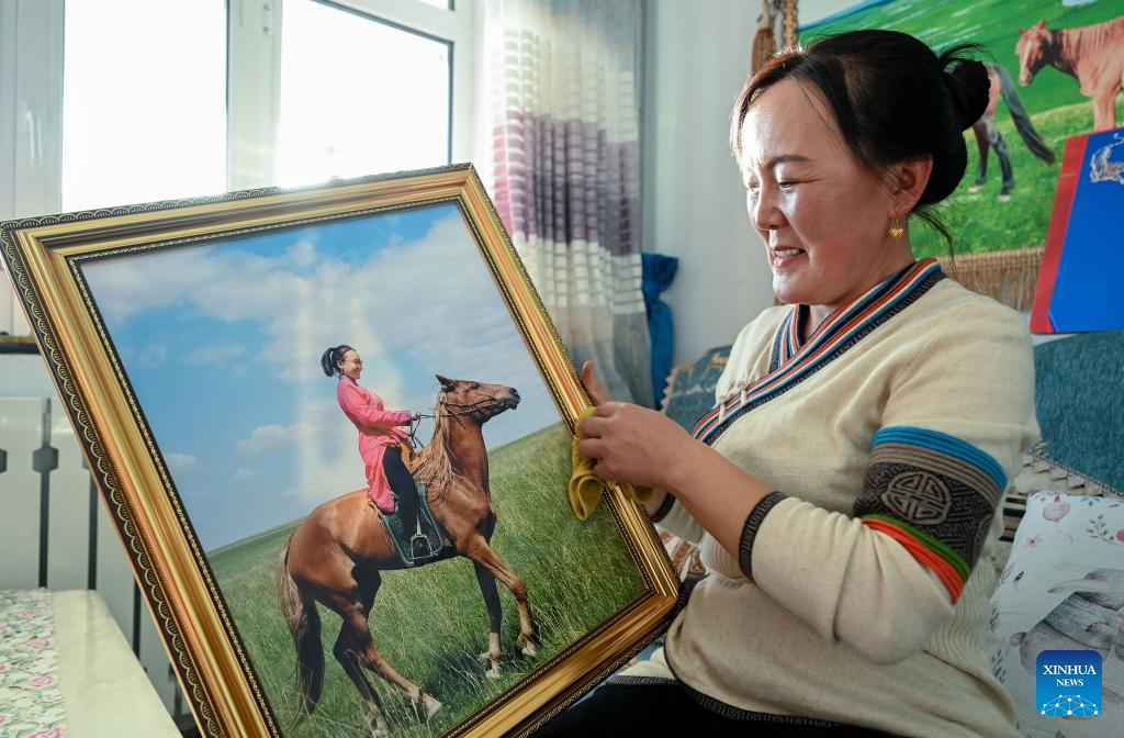 Erdendalai's wife Alima shows a picture of her daughter at home in Hulun Buir, north China's Inner Mongolia Autonomous Region, Dec. 16, 2023. (Xinhua/Bei He)