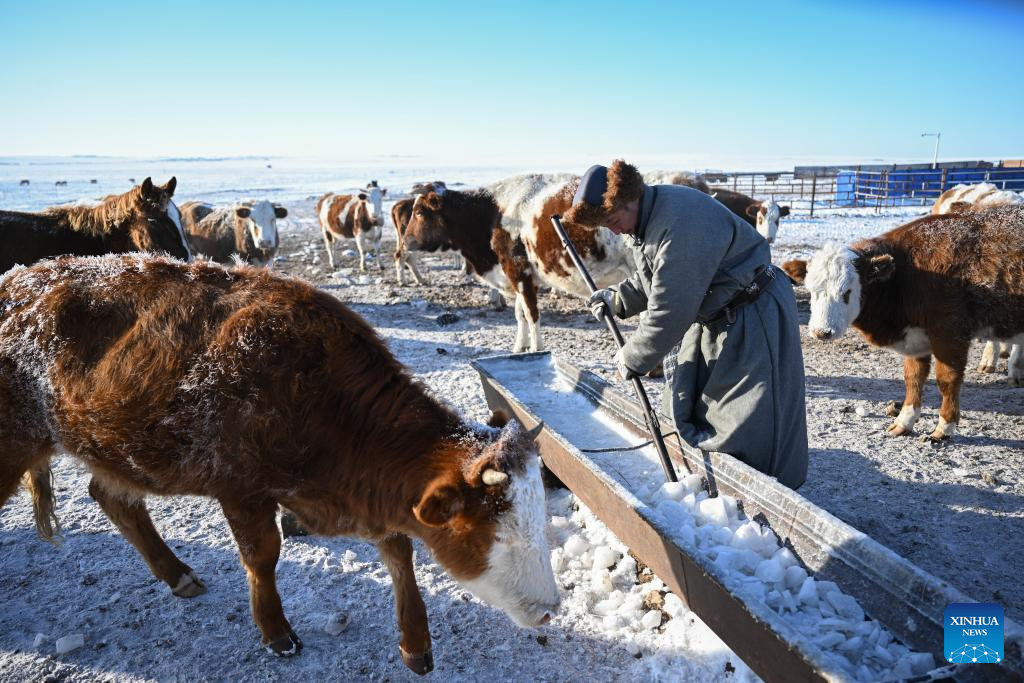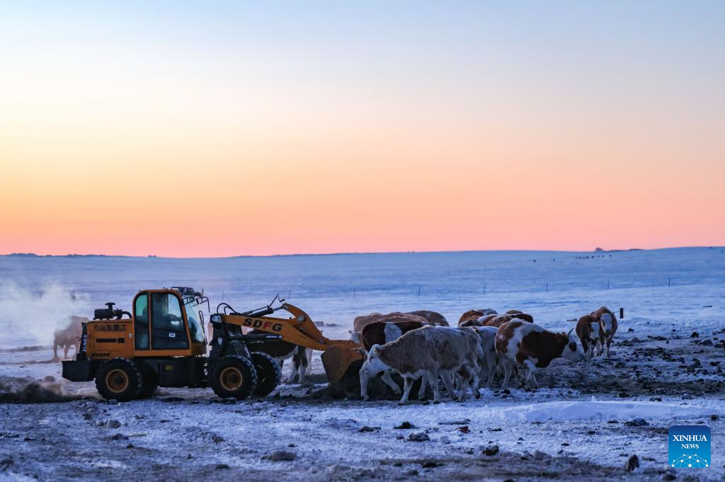 Erdendalai drives a forklift to feed his cattle in Hulun Buir, north China's Inner Mongolia Autonomous Region, Dec. 16, 2023. (Xinhua/Wang Kaiyan)