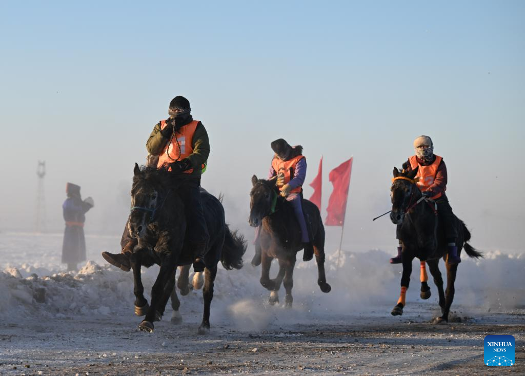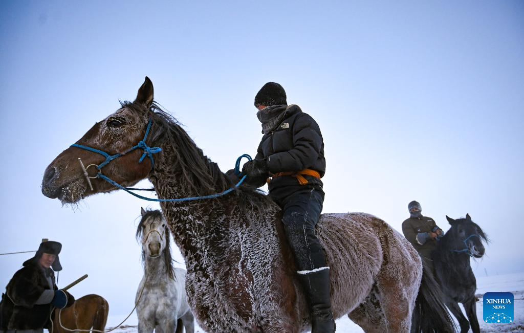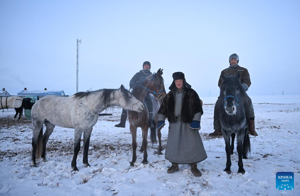 Nairag (1st L) takes part in a horse racing competition of the Nadam fair in Hulun Buir, north China's Inner Mongolia Autonomous Region, Dec. 17, 2023. (Xinhua/Wang Kaiyan)