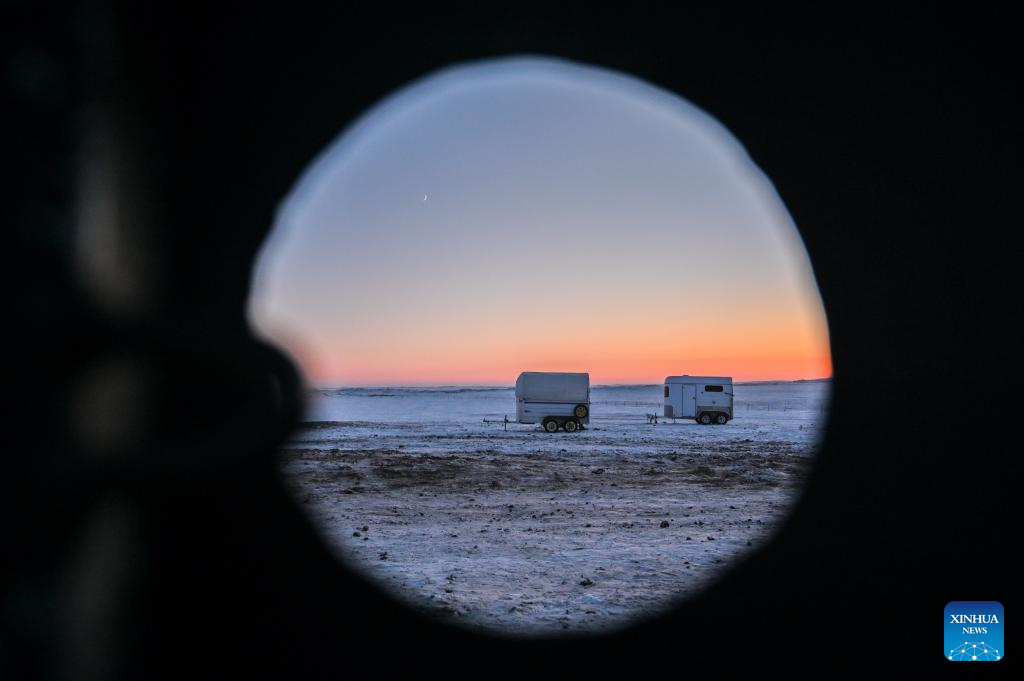 Two horse trailers park on the pasture at Erdendalai's home in Hulun Buir, north China's Inner Mongolia Autonomous Region, Dec. 16, 2023. (Xinhua/Wang Kaiyan)