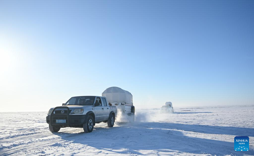 Two horse trailers set off from Erdendalai's home and head for the horse racing venue of the Nadam fair in Hulun Buir, north China's Inner Mongolia Autonomous Region, Dec. 17, 2023. (Xinhua/Wang Kaiyan)