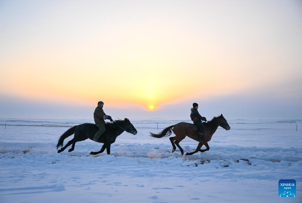 The sun was setting slowly, and the Hulun Buir prairie was freezing cold, but the racecourse was full of enthusiasm. People and horses here composed a wonderful "winter pastoral" together on the snow-covered grassland. (Xinhua/Bei He)