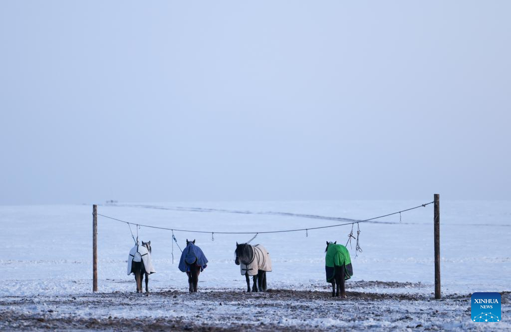 Erdendalai's horses are pictured in Hulun Buir, north China's Inner Mongolia Autonomous Region, Dec. 15, 2023. (Xinhua/Wang Kaiyan)