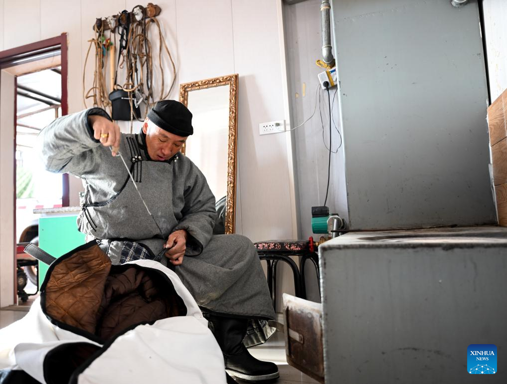 Erdendalai makes jackets for horses at home in Hulun Buir, north China's Inner Mongolia Autonomous Region, Dec. 16, 2023. (Xinhua/Bei He)