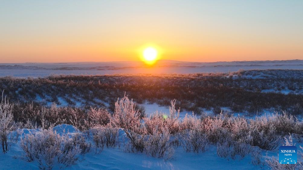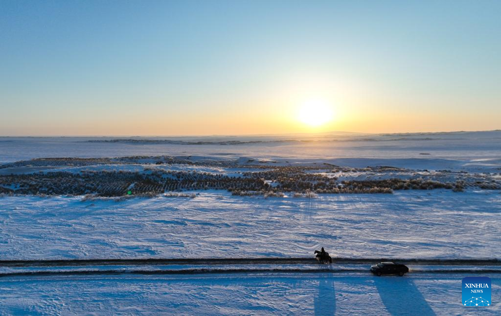 This aerial photo shows a sunset view on Erdendalai's pasture in Hulun Buir, north China's Inner Mongolia Autonomous Region, Dec. 16, 2023. (Xinhua/Bei He)