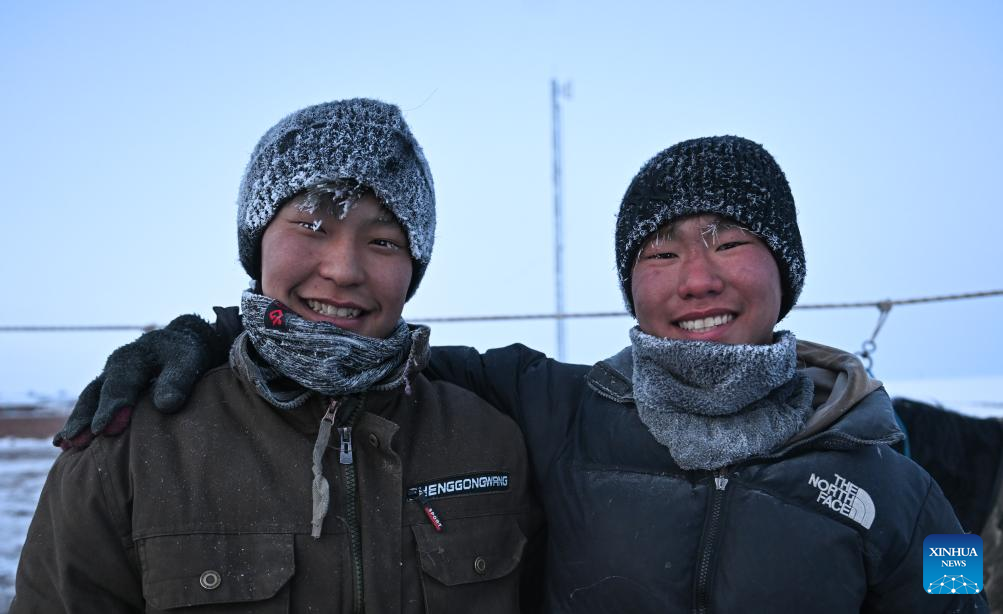 Nairag (R) and Ijil pose for a photo after horse training in Hulun Buir, north China's Inner Mongolia Autonomous Region, Dec. 15, 2023. (Xinhua/Bei He)