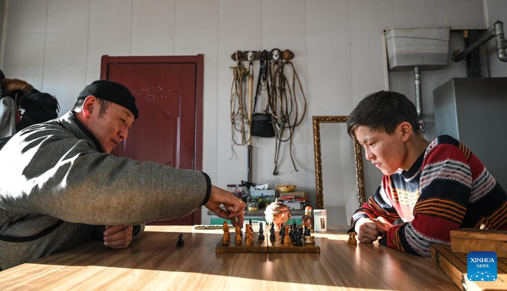 Erdendalai (L) and Ijil play chess at home in Hulun Buir, north China's Inner Mongolia Autonomous Region, Dec. 16, 2023. (Xinhua/Wang Kaiyan)