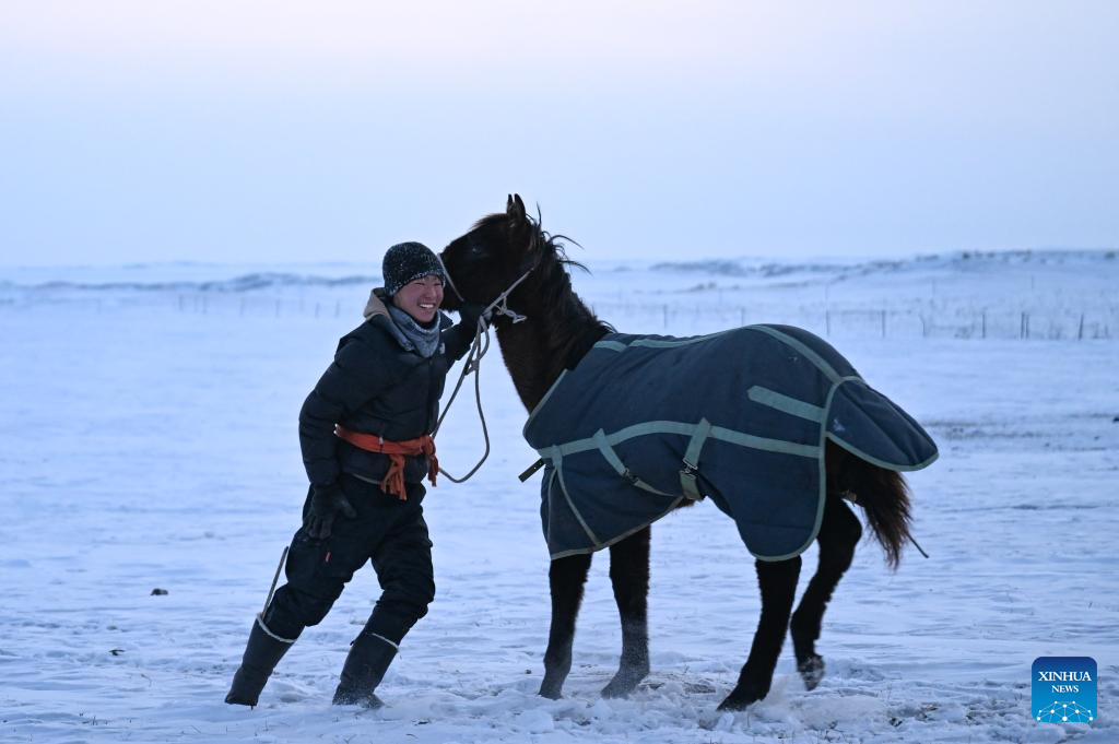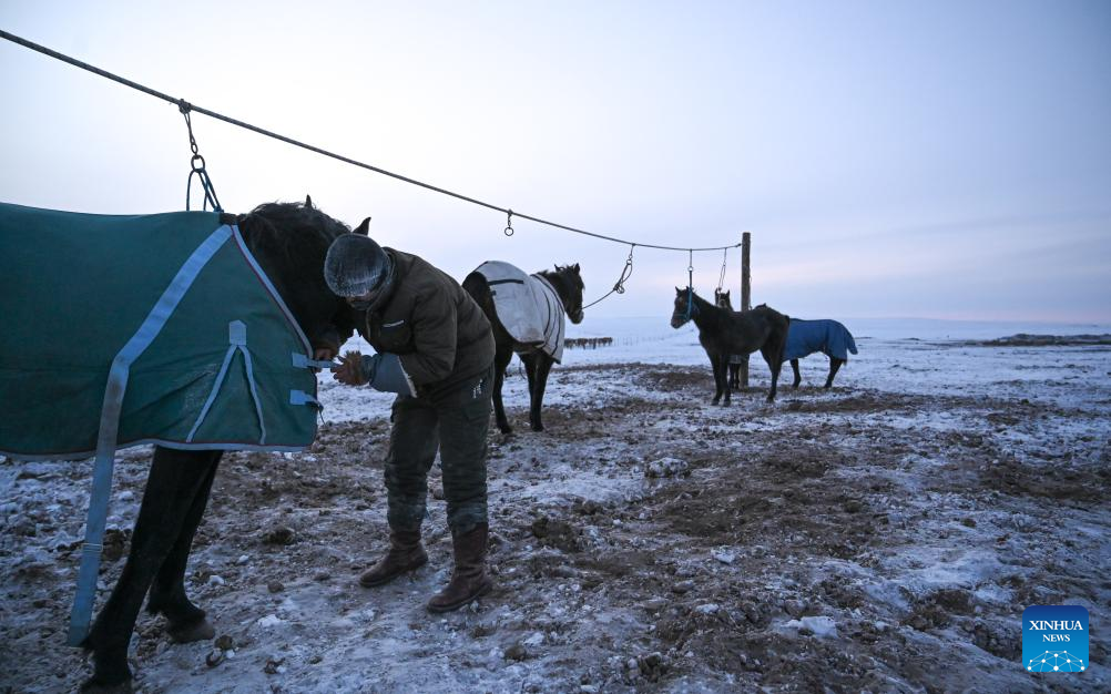 Erdendalai puts on a jacket for a horse in Hulun Buir, north China's Inner Mongolia Autonomous Region, Dec. 16, 2023. (Xinhua/Wang Kaiyan)