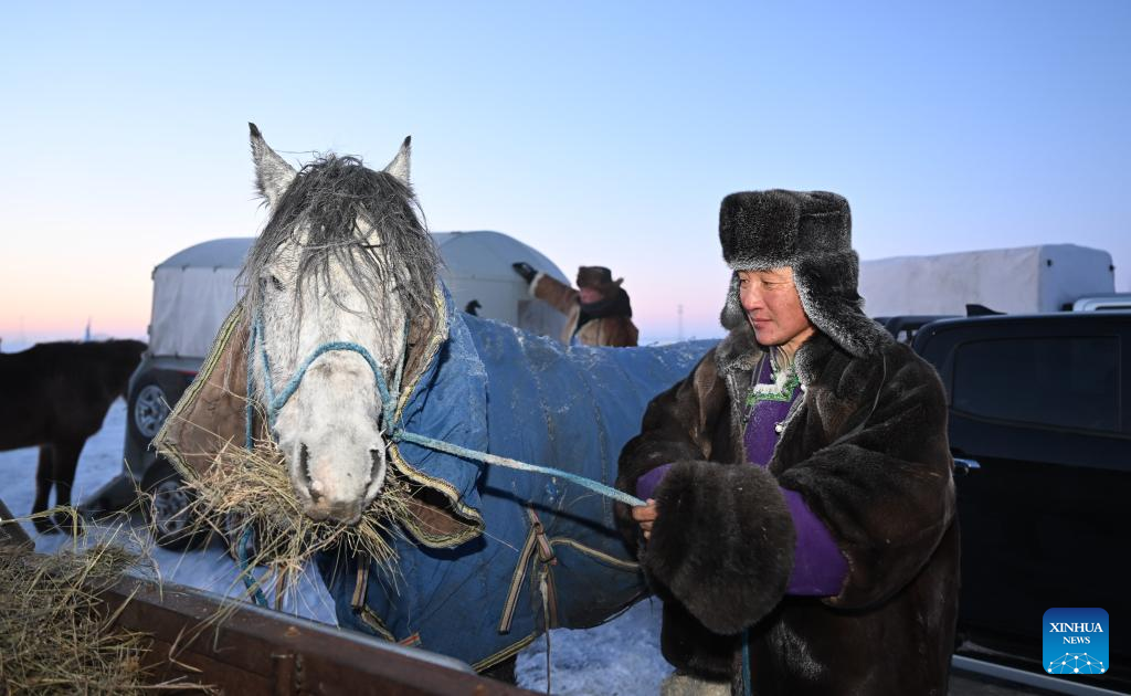 Erdendalai feeds a horse after a race in Hulun Buir, north China's Inner Mongolia Autonomous Region, Dec. 17, 2023. (Xinhua/Bei He)
