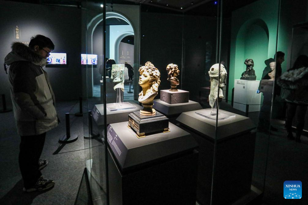 A visitor looks at a sculpture during an exhibition titled "Glory of Bronze Civilization" in the Museum of Shanghai University in Shanghai, east China, Dec. 22, 2023. The exhibition features sculptures by the French sculptor Auguste Rodin and bronze relics from China's Sanxingdui Ruins. (Xinhua/Xin Mengchen)