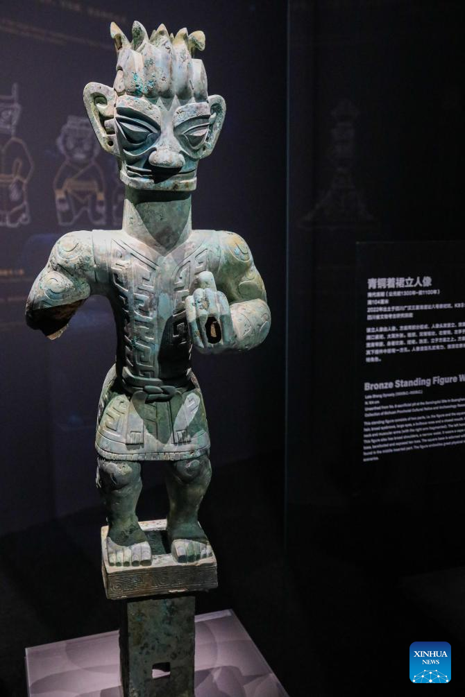 A bronze relic from China's Sanxingdui Ruins is displayed during an exhibition titled "Glory of Bronze Civilization" in the Museum of Shanghai University in Shanghai, east China, Dec. 22, 2023. The exhibition features sculptures by the French sculptor Auguste Rodin and bronze relics from China's Sanxingdui Ruins. (Xinhua/Xin Mengchen)