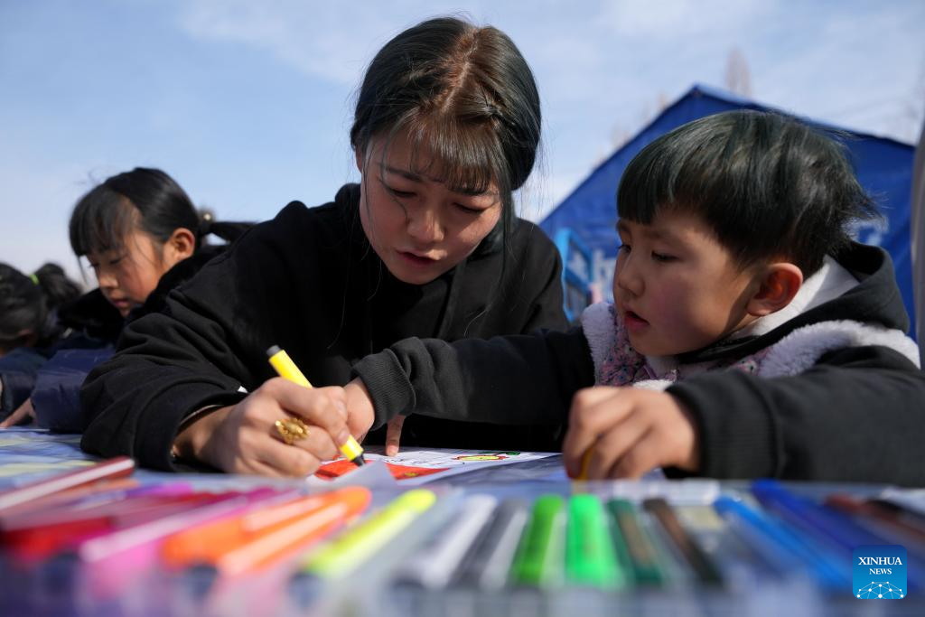 A volunteer draws with a child at a temporary relocation site in Dahejia Township, Jishishan County, northwest China's Gansu Province, Dec. 22, 2023. After a 6.2-magnitude earthquake hit Gansu Province late Monday, volunteers and psychotherapists started to provide quake-affected children at the temporary relocation site with voluntary classes, including activities such as drawing, games, tutoring, etc. (Xinhua/Chen Bin)