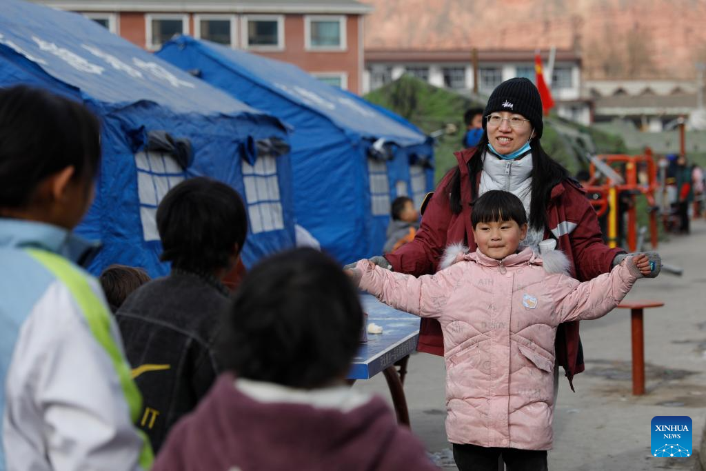 Psychotherapist Hu Jinya (back) plays games with children at a temporary relocation site in Dahejia Township, Jishishan County, northwest China's Gansu Province, Dec. 22, 2023. After a 6.2-magnitude earthquake hit Gansu Province late Monday, volunteers and psychotherapists started to provide quake-affected children at the temporary relocation site with voluntary classes, including activities such as drawing, games, tutoring, etc. (Xinhua/Fang Xin)