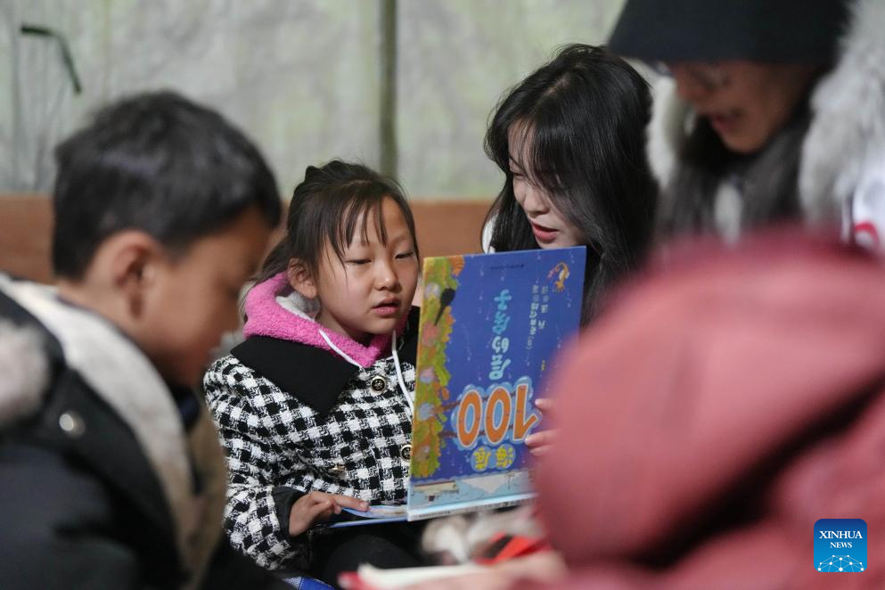 Volunteer Ma Xianghua (3rd L) reads books with a child at a temporary relocation site in Dahejia Township, Jishishan County, northwest China's Gansu Province, Dec. 22, 2023. After a 6.2-magnitude earthquake hit Gansu Province late Monday, volunteers and psychotherapists started to provide quake-affected children at the temporary relocation site with voluntary classes, including activities such as drawing, games, tutoring, etc. (Xinhua/Chen Bin)
