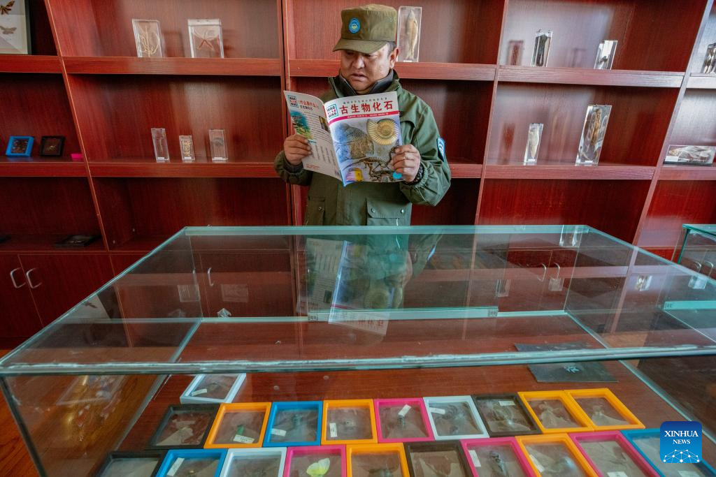 Kelsang Lhundrup reads a magazine next to fossil specimens displayed at Norbu Yugyel wildlife protection station of the Changtang National Nature Reserve in southwest China's Xizang Autonomous Region, Dec. 21, 2023. (Xinhua/Jiang Fan)