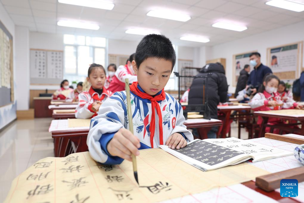 Students practise calligraphy at a school of the Xinjiang Production and Construction Corps in northwest China's Xinjiang Uygur Autonomous Region, Dec. 19, 2023. Practical and specific measures are being taken to ensure local people's well-being in the ongoing national program that rallies all-round support for Xinjiang, and the Xinjiang Production and Construction Corps is one of the many examples. (Xinhua/Hu Huhu)