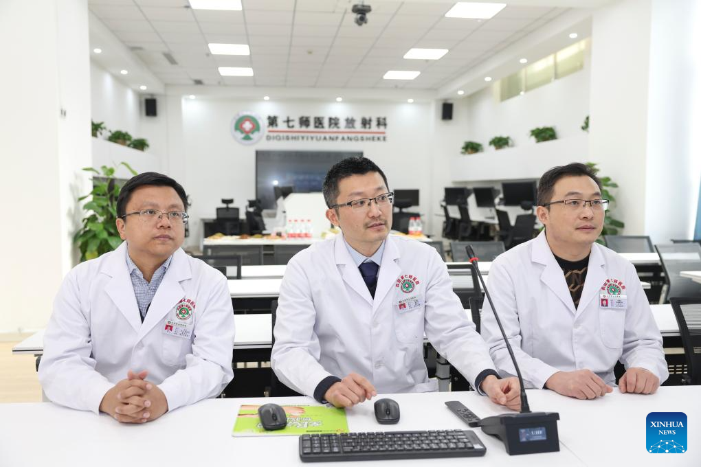 Hu Guodong (C), a doctor from east China's Jiangsu Province, attends a joint diagnose meeting via video for patients of a grassroots clinic, at a hospital of the Xinjiang Production and Construction Corps in northwest China's Xinjiang Uygur Autonomous Region, Dec. 23, 2023. Practical and specific measures are being taken to ensure local people's well-being in the ongoing national program that rallies all-round support for Xinjiang, and the Xinjiang Production and Construction Corps is one of the many examples. (Xinhua/Hu Huhu)