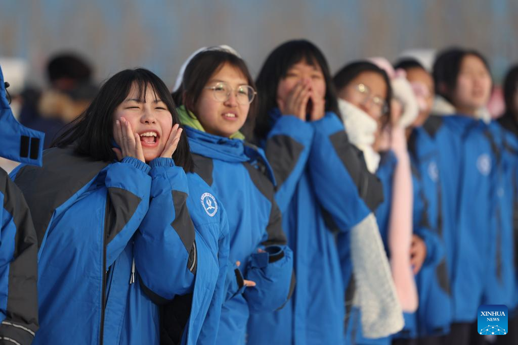 Students watch a snowfield football game at a middle school of the Xinjiang Production and Construction Corps in northwest China's Xinjiang Uygur Autonomous Region, Dec. 23, 2023. Practical and specific measures are being taken to ensure local people's well-being in the ongoing national program that rallies all-round support for Xinjiang, and the Xinjiang Production and Construction Corps is one of the many examples. (Xinhua/Hu Huhu)