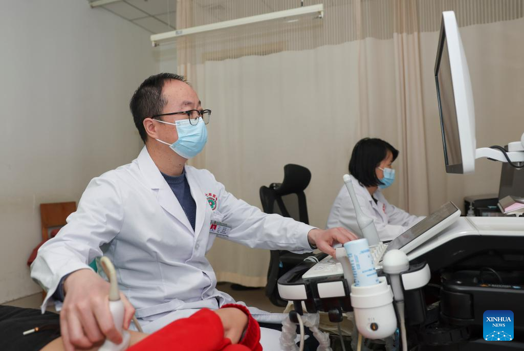Liu Tianyou, a doctor from east China's Jiangsu Province, performs an examination for a patient at a hospital of the Xinjiang Production and Construction Corps in northwest China's Xinjiang Uygur Autonomous Region, Dec. 23, 2023. Practical and specific measures are being taken to ensure local people's well-being in the ongoing national program that rallies all-round support for Xinjiang, and the Xinjiang Production and Construction Corps is one of the many examples. (Xinhua/Hu Huhu)