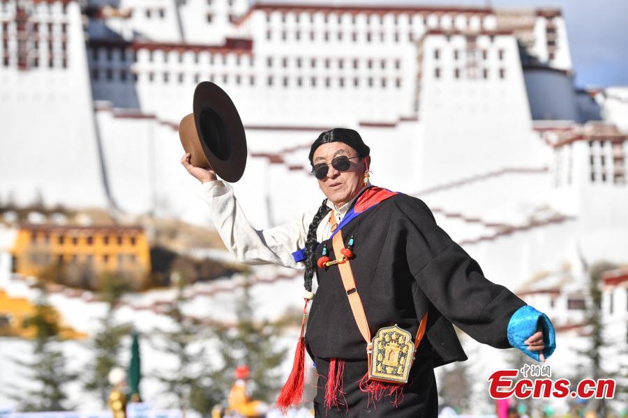 Models present traditional Tibetan costumes during the first Lhasa Fashion Week held at the Potala Palace square in Lhasa, southwest China's Xizang Autonomous Region, Dec. 24, 2023. Models presented 60 traditional Tibetan costumes in the fashion show. (Photo/China News Service)