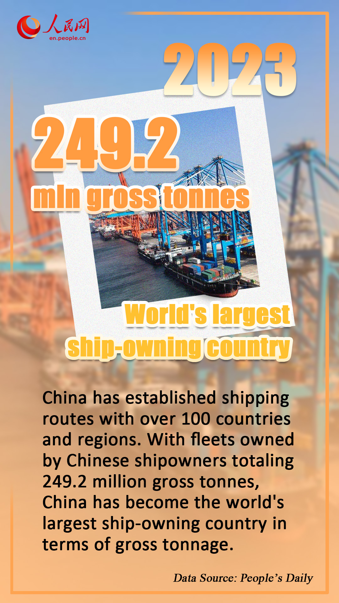 China has established shipping routes with over 100 countries and regions. With fleets owned by Chinese shipowners totaling 249.2 million gross tonnes, China has become the world's largest ship-owning country in terms of gross tonnage. Additionally, the country also leads globally in other indicators, such as port cargo throughput and container throughput.