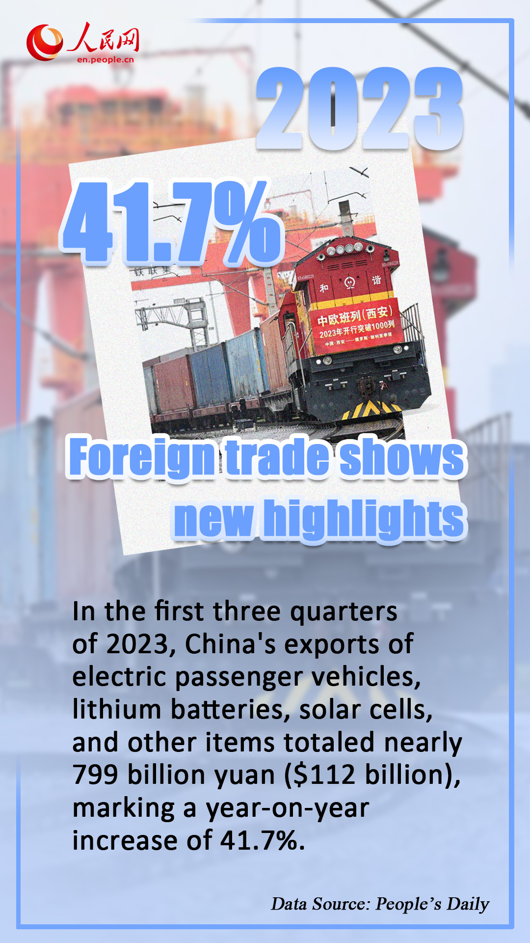 In the first three quarters of 2023, China's exports of electric passenger vehicles, lithium batteries, solar cells, and other items totaled nearly 799 billion yuan ($112 billion), marking a year-on-year increase of 41.7 percent. These new growth areas in China’s exports reflect the country’s optimized foreign trade structure and commitment to high-quality development.