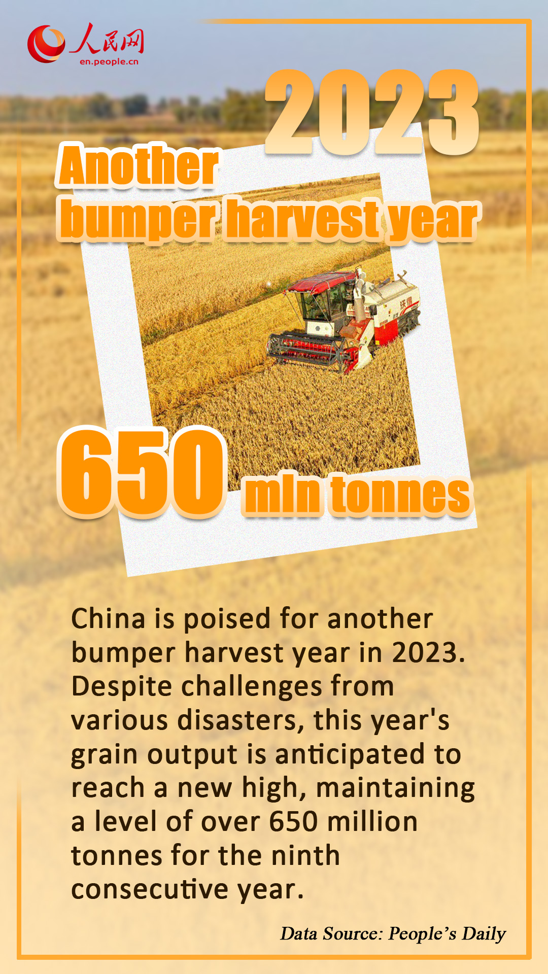 China is poised for another bumper harvest year in 2023, underscoring the country's enhanced capacity to ensure food security. Despite challenges from various disasters, this year's grain output is anticipated to reach a new high, maintaining a level of over 650 million tonnes for the ninth consecutive year.