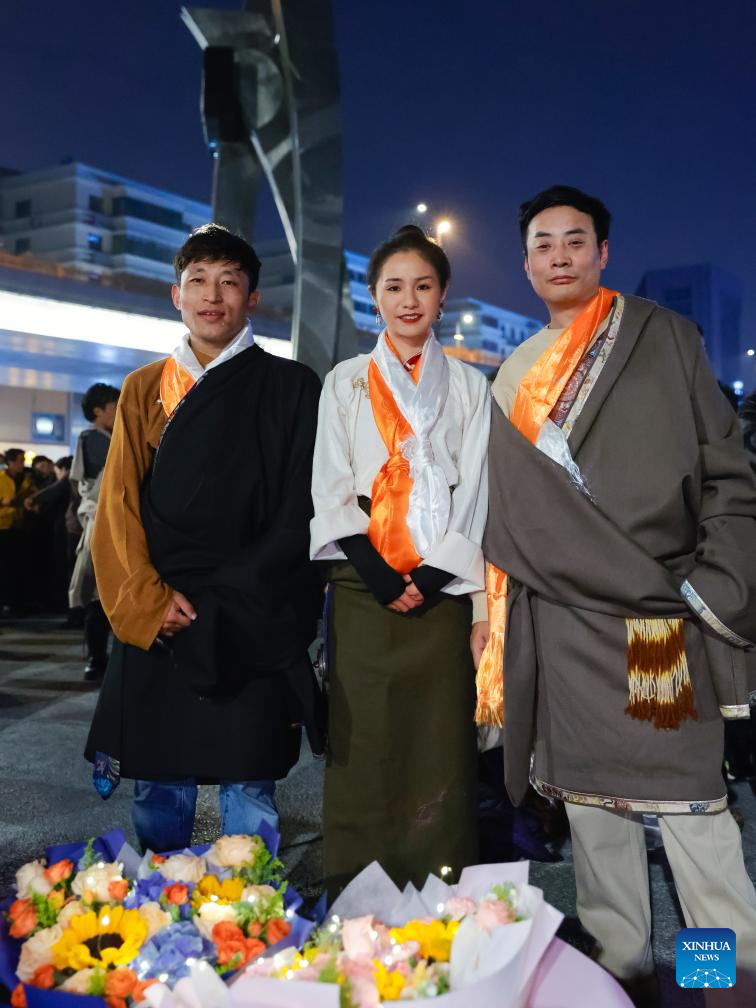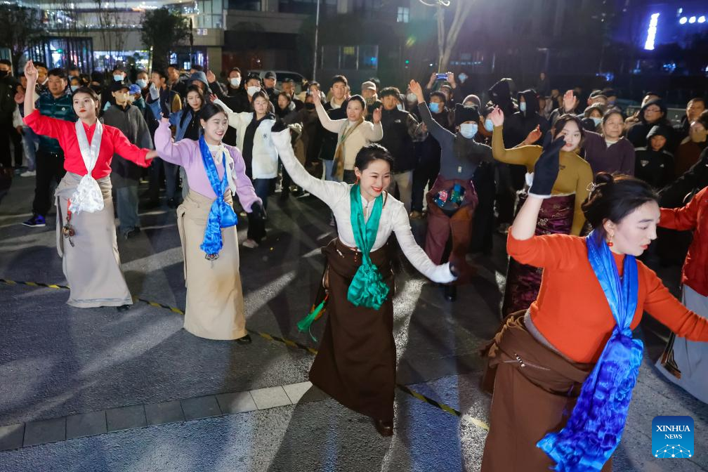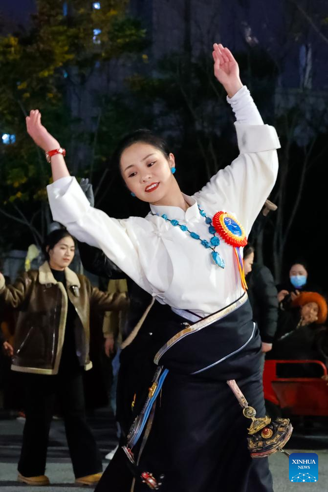 CHENGDU, Dec. 25 (Xinhua) -- At a public square in Chengdu, a bustling city of over 20 million people in southwestern China, 24-year-old Tibetan dancer Yanggyi, prepared for her performance, adjusting her traditional attire and the bun behind her head.