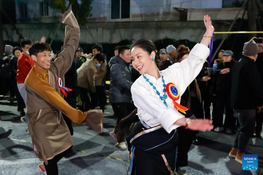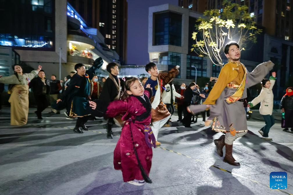 Dancers (front), who come from a Guozhuang dance troupe in Yushu Tibetan Autonomous Prefecture of Qinghai Province, dance with local dancers at a square in Chengdu, southwest China's Sichuan Province, Dec. 23, 2023. (Xinhua/Shen Bohan)