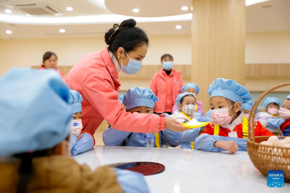 Yanggyi prepares to work at a kindergarten in Chengdu, southwest China's Sichuan Province, Dec. 15, 2023. (Xinhua/Shen Bohan)