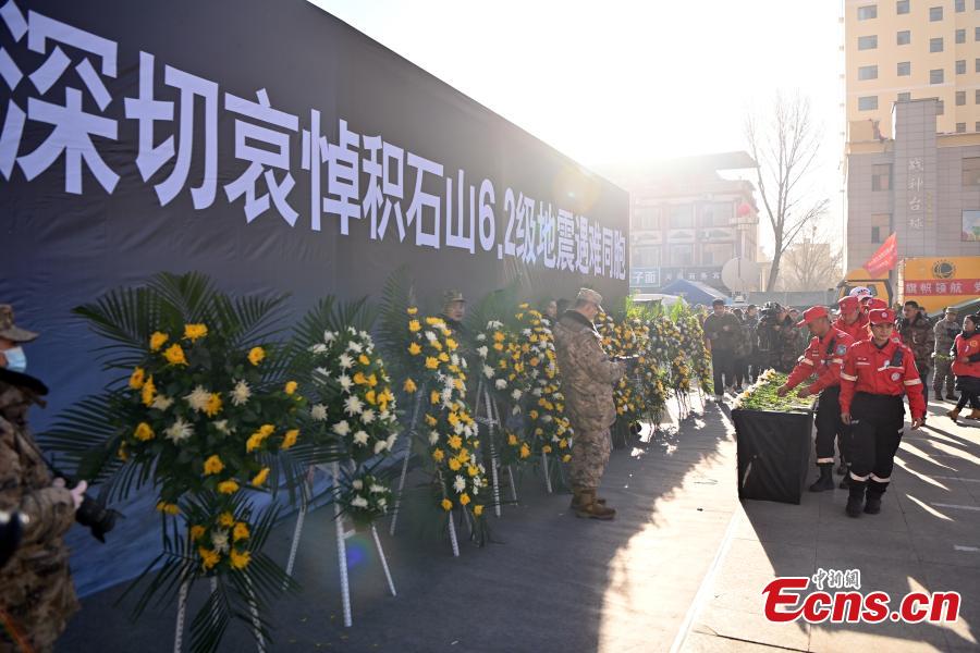 People lay flowers to mourn earthquake victims during a mourning ceremony for earthquake victims at Dahejia Township of Jishishan County, northwest China's Gansu Province, Dec. 25, 2023. (Photo/China News Service)