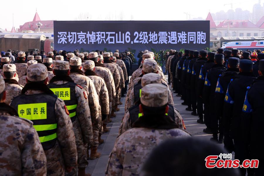 People pay a silent tribute during a mourning ceremony for earthquake victims at Dahejia Township of Jishishan County, northwest China's Gansu Province, Dec. 25, 2023. (Photo/China News Service)