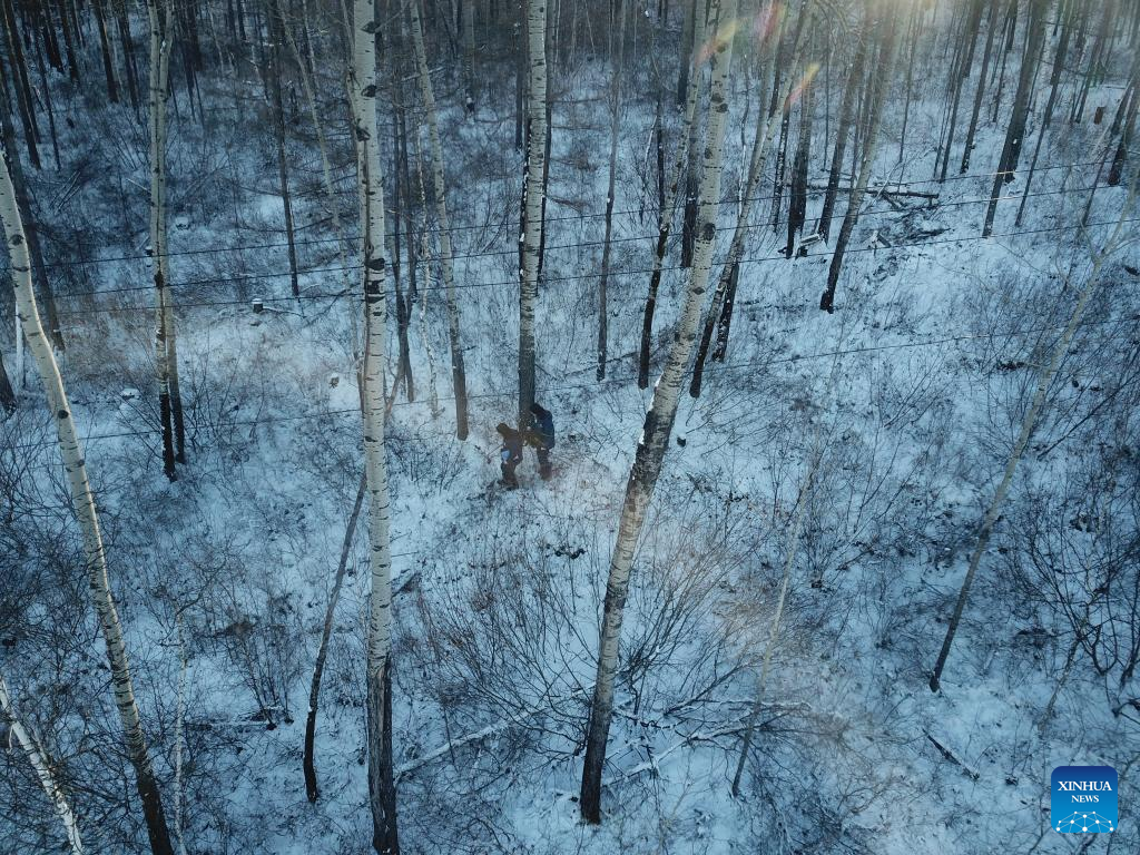 This aerial photo taken on Dec. 23, 2023 shows power line maintenance workers conducting power line patrol in Mohe, northeast China's Heilongjiang Province. In Mohe, the northernmost city of China, workers from all walks of life are faced with extremely cold climate in winter. People of different professions stick to their posts here despite harsh winter weather to protect the environment and safeguard life of local residents and tourists. (Xinhua/Shi Feng)