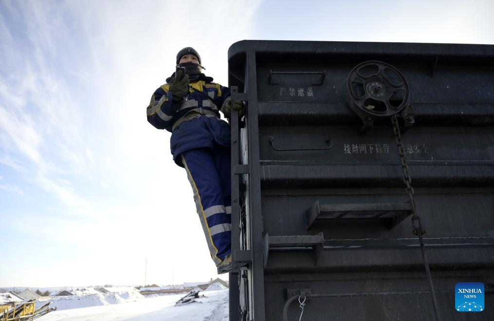 A train dispatcher stands on a train ladder in Mohe, northeast China's Heilongjiang Province, Dec. 25, 2023. In Mohe, the northernmost city of China, workers from all walks of life are faced with extremely cold climate in winter. People of different professions stick to their posts here despite harsh winter weather to protect the environment and safeguard life of local residents and tourists. (Xinhua/Shi Feng)