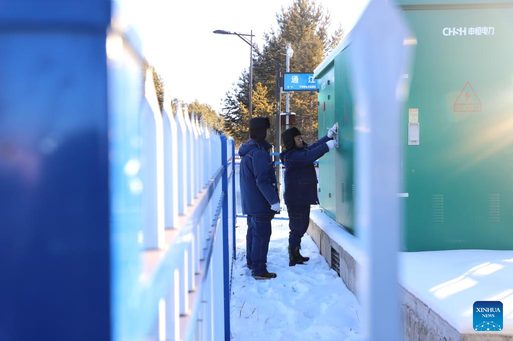 Director Lyu Jiansheng (R) and his colleague Wang Shaoting, staff members of a local power supply station, inspect power supply devices in Beiji Village of Mohe, northeast China's Heilongjiang Province, Dec. 23, 2023. In Mohe, the northernmost city of China, workers from all walks of life are faced with extremely cold climate in winter. People of different professions stick to their posts here despite harsh winter weather to protect the environment and safeguard life of local residents and tourists. (Xinhua/Xu Kaixin)