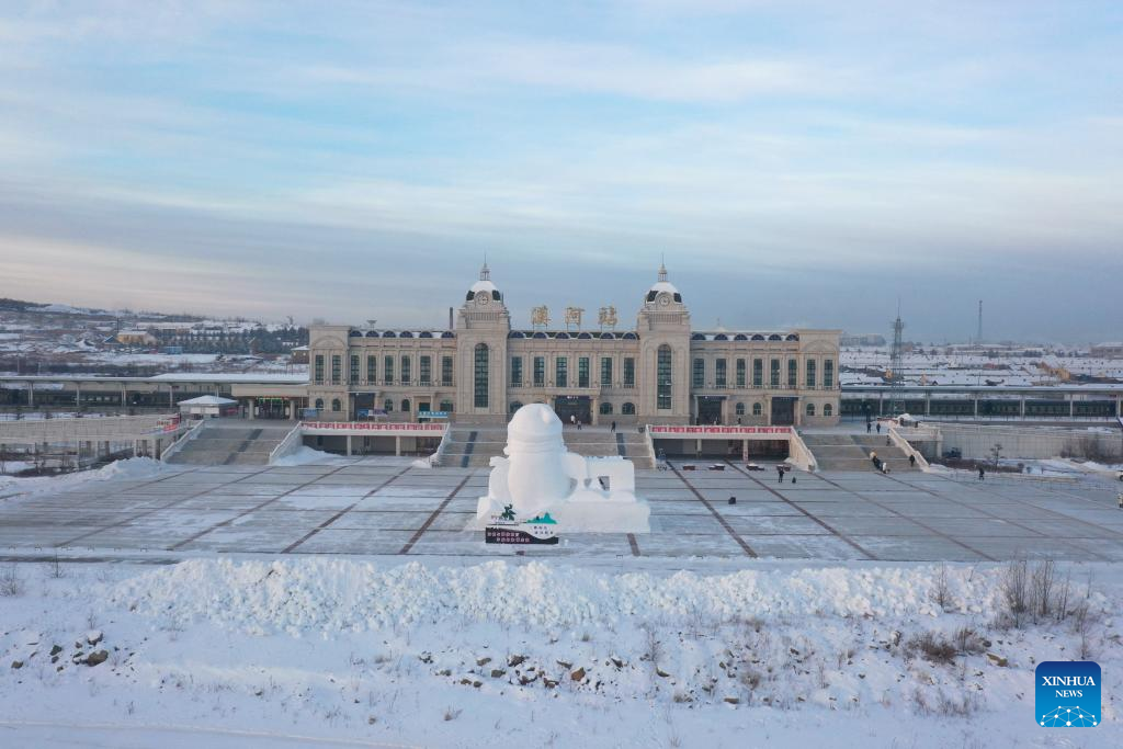 This aerial photo taken on Dec. 20, 2023 shows a view of Mohe Railway Station in Mohe, northeast China's Heilongjiang Province. In Mohe, the northernmost city of China, workers from all walks of life are faced with extremely cold climate in winter. People of different professions stick to their posts here despite harsh winter weather to protect the environment and safeguard life of local residents and tourists. (Xinhua/Shi Feng)