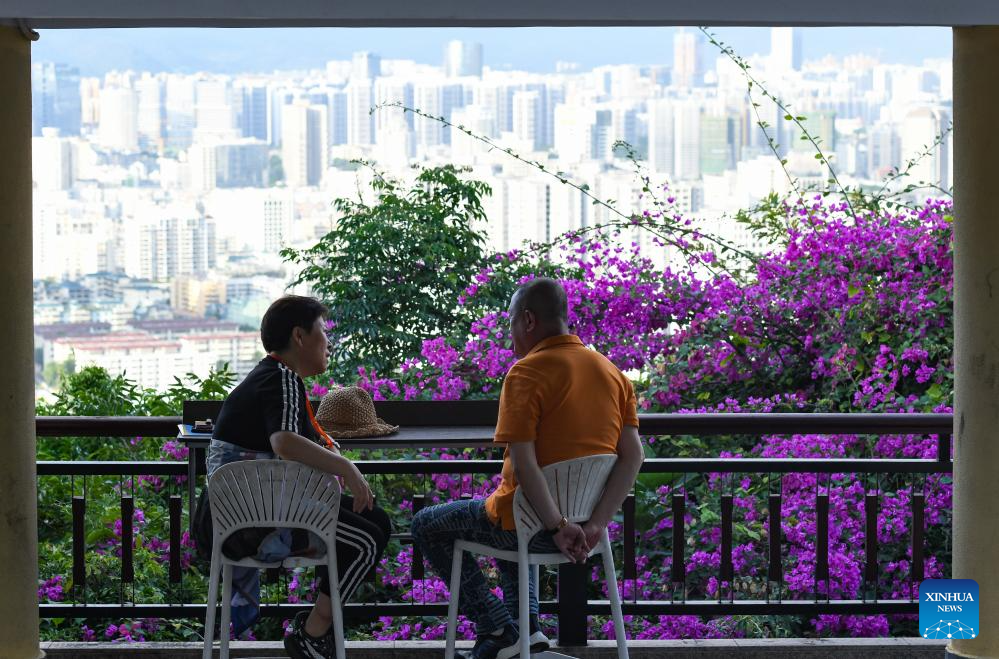 Tourists take a rest at a scenic area in Sanya, south China's Hainan Province, Dec. 15, 2023. Since the beginning of winter, the tourism market in Sanya has been heating up continuously. According to official data, the city witnessed a peak season for tourism since mid-November, which is expected to last until the Spring Festival. (Xinhua/Yang Guanyu)