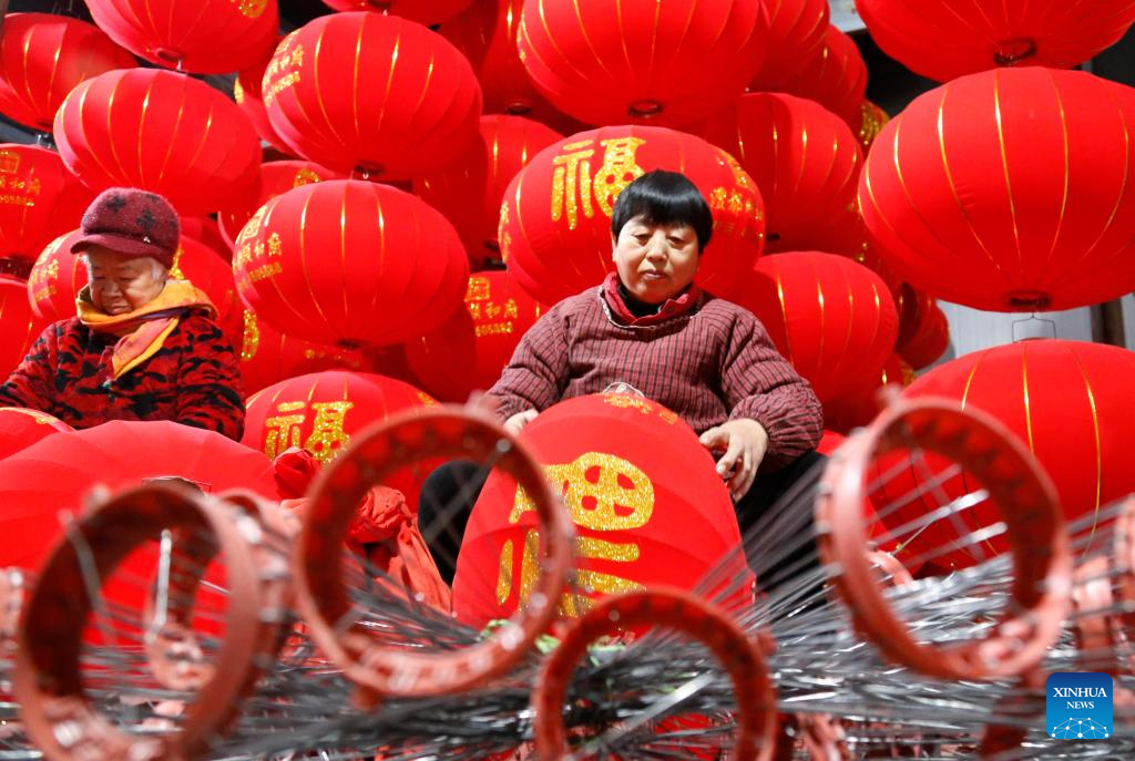 Workers make lanterns at a workshop in Dongshanzhao Township of Xingtai City, north China's Hebei Province, Dec. 27, 2023. As the new year approaches, lantern workshops increased the capacity of production in Xingtai City of Hebei Province to meet the market demand. (Photo by Zhang Chi/Xinhua)