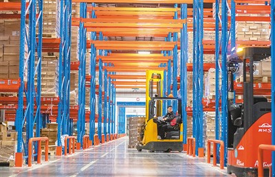 A worker delivers a forklift to transport cross-border e-commerce goods in Jinyi Comprehensive Bonded Zone, Jinhua, east China's Zhejiang Province, during the "Double 11" shopping spree in 2023. (Photo/Shi Kuanbing)