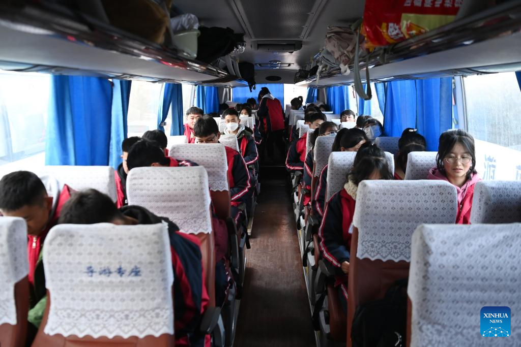Grade three students are seen on a bus at the Jishi High School in Jishishan County, northwest China's Gansu Province, Dec. 28, 2023. (Xinhua/Fan Peishen)