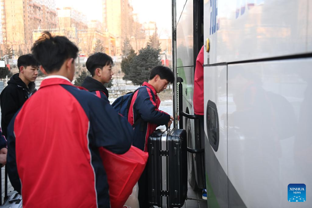A grade three student boards a bus at the Jishi High School in Jishishan County, northwest China's Gansu Province, Dec. 28, 2023. (Xinhua/Zhang Rui)