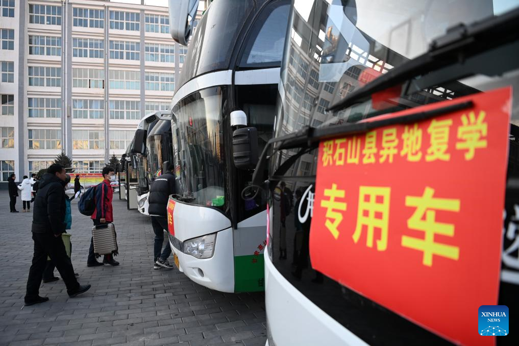 Hundreds of grade three students from Jishi High School were transported to Linxia Vocational and Technical School in Linxia Hui Autonomous Prefecture to resume class on Thursday. According to the arrangement of the education department, all the grade three high school students in Bonan-Dongxiang-Salar Autonomous County of Jishishan will resume class in other areas this week.