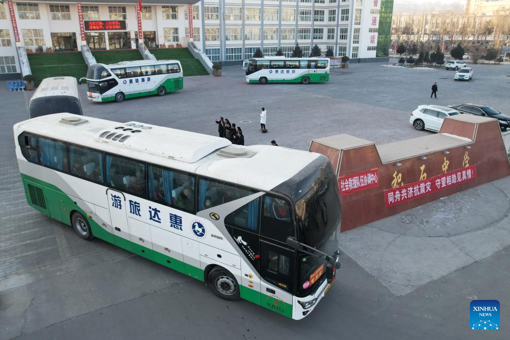 This aerial photo taken on Dec. 28, 2023 shows buses carrying grade three students leaving the Jishi High School in Jishishan County, northwest China's Gansu Province. (Xinhua/Fan Peishen)
