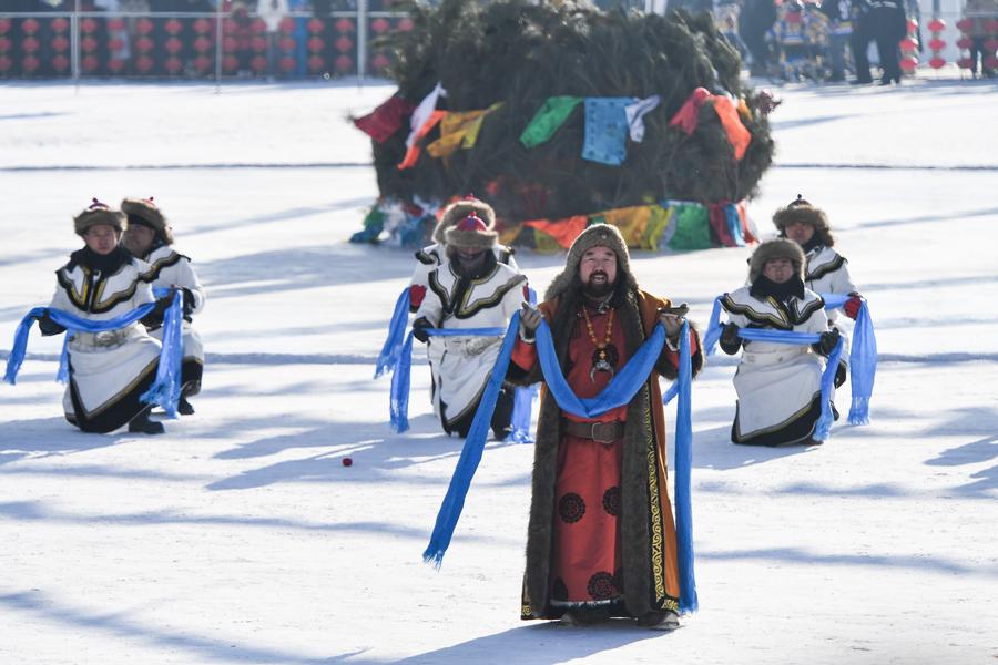 The opening ceremony of a winter fishing-themed festival is held on the Chagan Lake in Songyuan City, northeast China's Jilin Province, Dec. 28, 2023. (Xinhua/Zhang Nan)