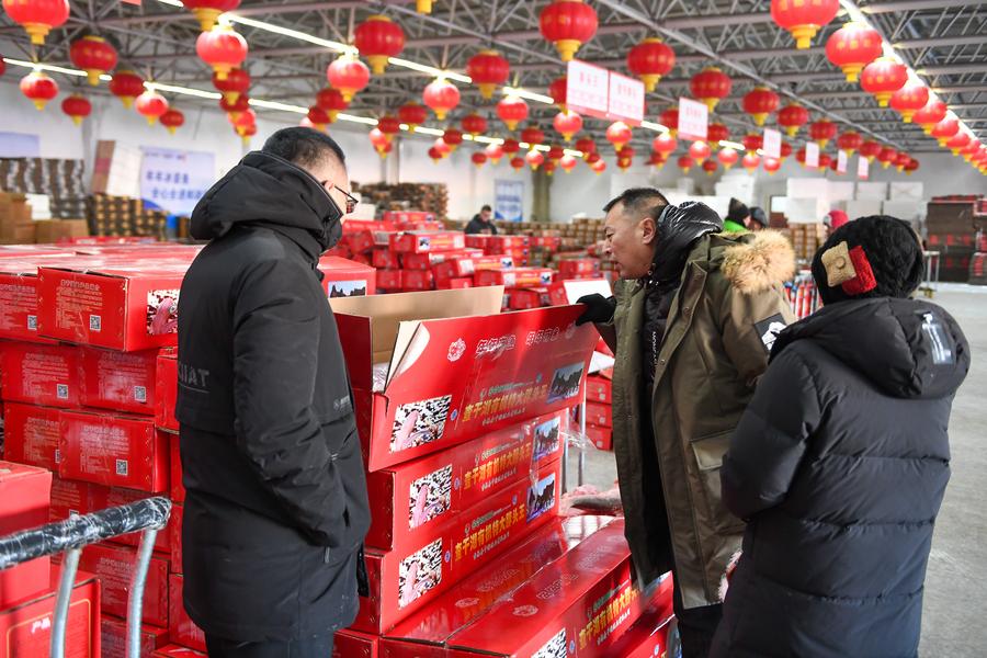 Tourists select goods at a fish market near Chagan Lake in Songyuan City, northeast China's Jilin Province, Dec. 27, 2023. (Xinhua/Zhang Nan)