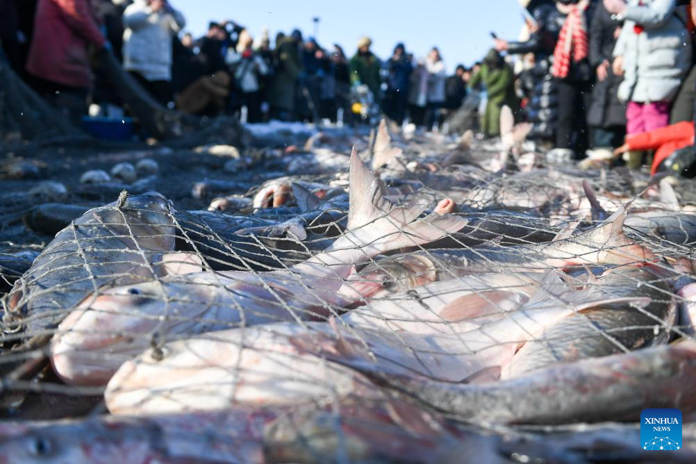 Fishes are seen during a winter fishing-themed festival on the Chagan Lake in Songyuan City, northeast China's Jilin Province, Dec. 28, 2023. (Xinhua/Zhang Nan)