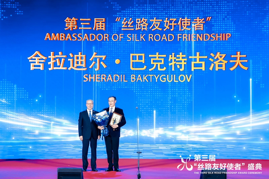 Sheradil Baktygulov (right) receives his award at the ceremony. (Photo provided to People’s Daily Online)