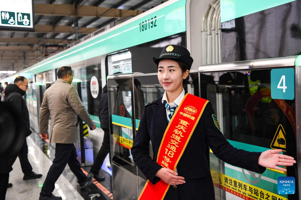 A staff member guides people to board a train of Chongqing Rail Transit Line 18 in southwest China's Chongqing Municipality, Dec. 28, 2023. Chongqing Rail Transit (CRT) Line 18, which is 29 kilometers long and has 19 stations, officially started initial operation on Thursday. So far, a total of 13 rail transit lines are in operation in the city with an operating length reaching 538 kilometers. (Xinhua/Wang Quanchao)