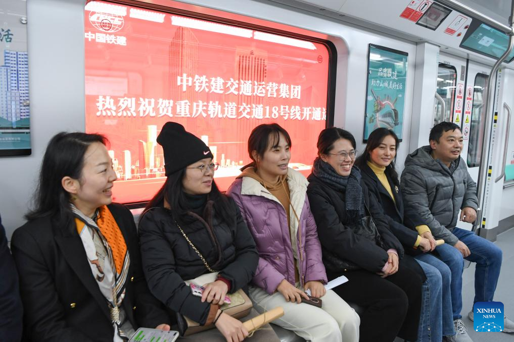 Passengers take Chongqing Rail Transit Line 18 in southwest China's Chongqing Municipality, Dec. 28, 2023. Chongqing Rail Transit (CRT) Line 18, which is 29 kilometers long and has 19 stations, officially started initial operation on Thursday. So far, a total of 13 rail transit lines are in operation in the city with an operating length reaching 538 kilometers. (Xinhua/Wang Quanchao)